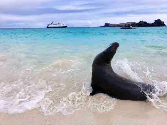 It’s our first full day of expedition on National Geographic Islander . We started our day with a morning hike on North Seymour, which is one of the best islands to observe nesting colonies of frigatebirds, blue-footed boobies, swallow-tailed gulls, and many more species of marine birds. Later in the morning, National Geographic Islander navigated to the beautiful Rabida Island, where we enjoyed an amazing afternoon. Guests swam and snorkeled with sea lions and many different species of reef fish off the red sand beach. We walked to a pond located behind the beach and observed flamingos nesting after more than 20 years on this island.