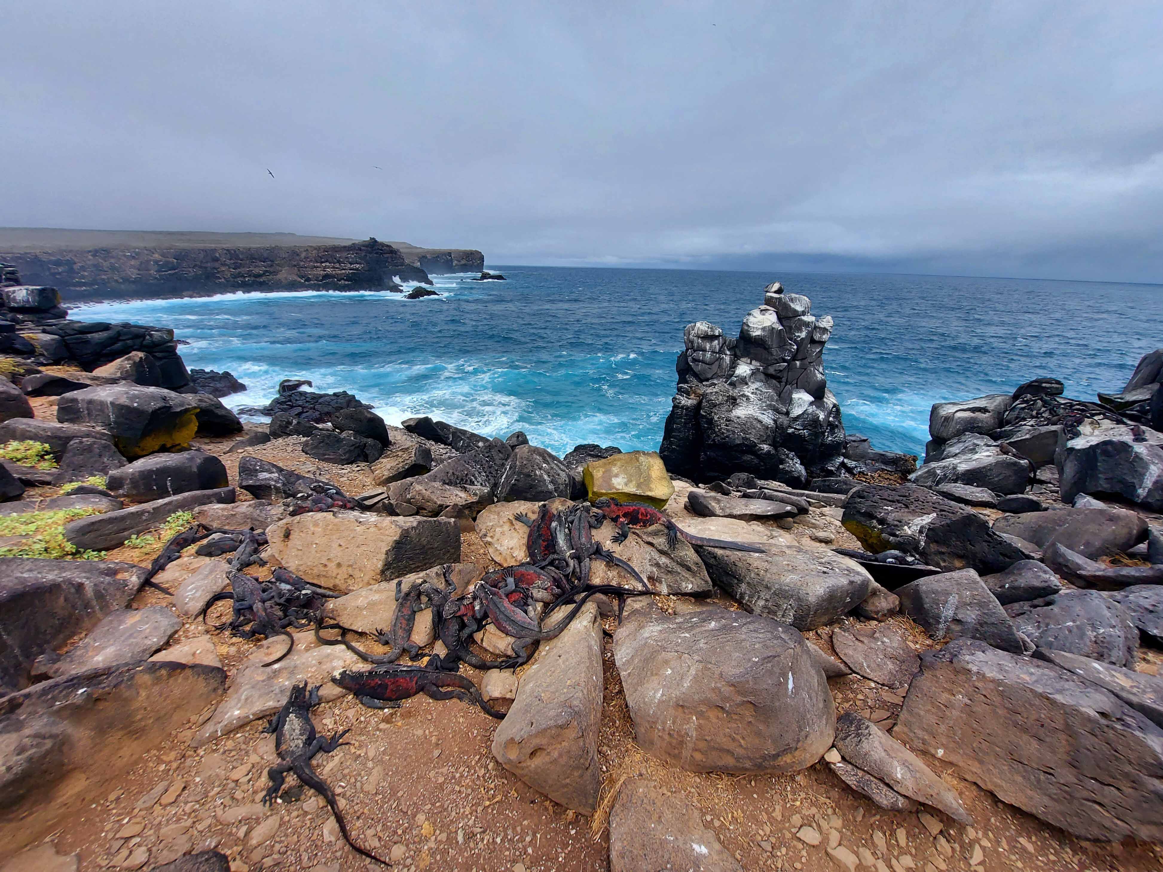 Today, National Geographic Endeavour II visited Cerro Dragon, located on the north part of Santa Cruz Island. We found one of the largest colonies of land iguanas. During our hike, we spotted the iguanas all around the trail. Some basked on the vegetation, and others were active. We saw the zigzag head movement they use to protect their territory and impress females. An Ecuadorian buffet lunch was set up in the dining room. We started with the traditional ceviche and ended with tres leches for dessert! We enjoyed snorkeling and Zodiac rides. We observed wildlife all over the place, including spotted eagle rays, sharks, blue-footed boobies, great blue herons, marine iguanas, and hundreds of other animals. They all reminded us why the Galapagos is so special.