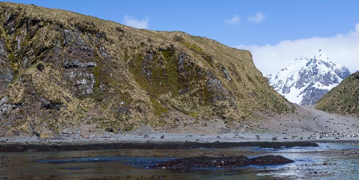 After a wild South Georgia initiation, all on board finally got to experience this incredible destination in the sunshine. After an early breakfast we made our way out for an epic day of expedition exploration. On the landing at Fortuna Bay, Zodiacs endured some rough conditions but all made it ashore safely and we were soon hiking our way out of the bay, retracing the footsteps of the Boss. The initial climb was masked by the fog but the sun began to burn through by the time we made it to Crean Bay. Before we descended to the Shackleton Waterfall the spectacular mountains could be seen towering up into the sky. After lunch Zodiacs were again in the water, this time for cruising in the beautiful Hercules Bay. All enjoyed magnificent views of light-mantled albatross and the waterfall but the highlights were the macaroni penguins. The hardy, crested penguins were forming a conveyor belt that moved out of the surf and up the steep mountainside to their colonies in the tussock.