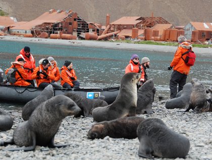 A visit in late February and early March to South Georgia will always be remembered for the sheer number of fur seal pups. The population nowadays is estimated in the several millions. Those staying near the beach at Stromness enjoyed playful fur seals pups in groups of maybe hundreds practicing their swimming abilities. It is hard not to be touched and drawn to these cute little seal pups. Although very ‘cute’ at this stage, from the first day born they have an instinct to bark and bite. The flatland behind the whaling station was literally filled with seal pups and also some nursing females as they do this for almost four months.