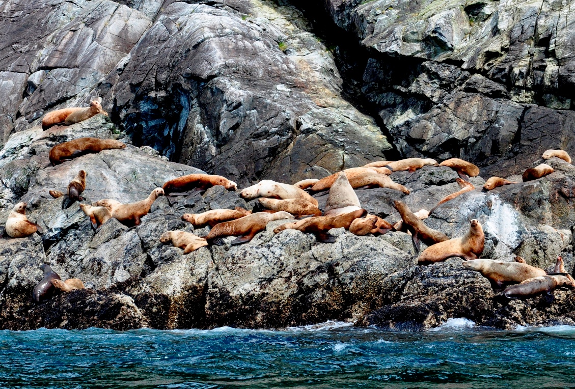 After a short reposition to the Inian Islands, we boarded the expedition landing crafts for an adventurous cruise amongst the small islands in search of more marine mammals.  When the tidewaters from the Pacific reach full ebb or flood in this area, the waters churn and froth, confusing the fish and make opportunities for the resident Stellar sea lions and bird life to find a meal.  It wasn’t long before we encountered the huge beasts (some males approach 2,000 lbs.) as they caught and devoured fish in the whirlpool waters between the islands.  Many eagles and gulls could be seen waiting their turn at the bounty once the sea lions were done consuming their prey. A lone humpback whale also plied the waters heading west in search of smaller fish during the long summer days of productivity.  A few sea otters were also seen searching for a meal in between bouts of preening to keep their fur buoyant and insulating.