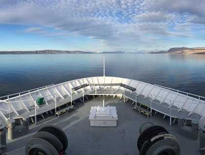 In recent memory according to our ice captain, Germain Tremblay, no ship has traversed Norwegian Bay without an icebreaker, yet today astonishingly there was hardly any ice to be seen! Throughout the morning we took up positions around the ship and watched as the marine cloud lifted and revealed the breathtaking scenery of this unexplored region unfolded around us: to port—the low, tundra covered slopes of Graham Island and on our starboard—the Bjorne Peninsula of Ellesmere Island. Off on the northern horizon the glaciers of Axel Heiberg Island appeared to spill down into surrounding fjords like waterfalls. Part of the Sverdrup Islands that belonged to Norway until 1930, Axel Heiberg Island is Canada’s seventh largest island.