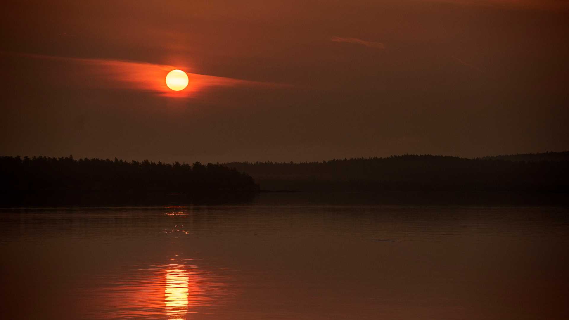 National Geographic Venture cruised in still, calm seas, making her way towards our morning destination of Friday Harbor and San Juan Island. Due to many forest fires and three months without rain, our sunrise was a deep reddish orange…a smokey sunrise in these northwestern waters of Washington State.