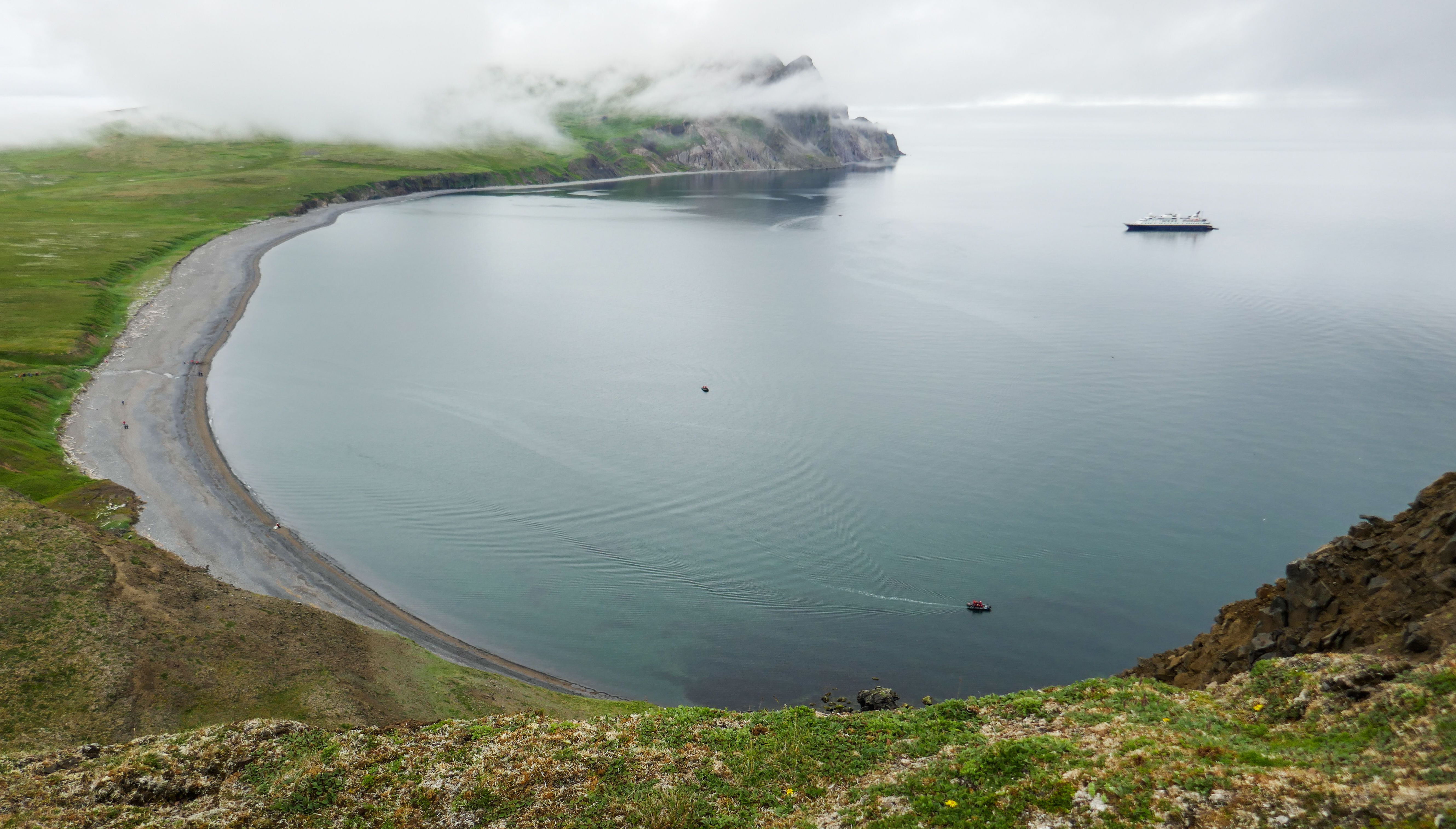 Today National Geographic Orion made its way across glassy waters to Saint Matthew, the most remote island in the Bering Sea. Approaching Hall Island off the northern tip of St Matthew, the conditions while foggy were the some of the calmest our Bering Sea has ever seen. Murres, fulmars, and auklets bounced across glassy water and welcomed us to their remote domain. The islands of Hall and St Matthew support over a million colonial-nesting sea birds, as well as ground-nesting bird species, including the endemic McKay’s bunting (Plectrophenax hyperboreus) and a major portion of the total breeding population of Pribilof rock sandpipers. Thanks to the attention given to the island during the Harriman Expedition in 1899, Teddy Roosevelt included St. Matthew in a group of islands designated as America’s first wildlife refuges in 1909. Today this area is a part of the much larger Alaska Maritime National Wildlife Refuge.