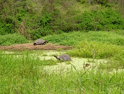 Our meal was exquisite and took place over a nice restaurant located way into the highlands of Santa Cruz. We were totally satisfied with the food (also somehow sleepy, too) but we rallied ourselves and off we went for our next encounter with the giant tortoises, this time in the wild. Certainly we were prepared for these big reptiles but all of the sudden our attention was deviated by many other surprises; there were woodpecker finches, tree finches, vermillion fly-catchers just at the same area were several tortoises were found. These endemic reptiles were also found in a nice pool formed by natural fresh water under the good company of white cheeked pintail ducks and moorhens.