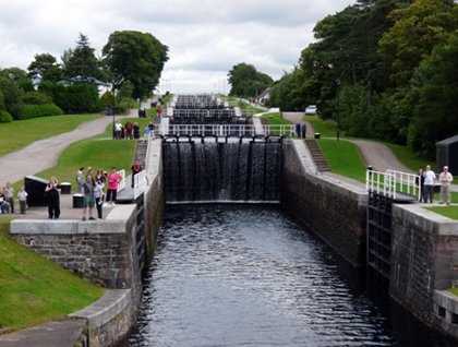 Early in the morning we sail out of Oban bay past the island of Lismore and travel into Loch Linnhe. After Steve and Konia’s presentations we travel past Corran lighthouse, into the narrower part of Loch Linnhe. Once we are level with Fort William we are joined by a BBC film crew, recording the progress of the Lord of the Glens into the Caledonian Canal and up Neptune’s staircase. The footage will broadcast as part of the next series of ‘Coast’, a program about the shores of the UK. Right on cue, the sun comes out and highlights our journey into the canal, this marvelous piece of engineering. Neptune’s staircase is one of the most amazing feats – these eight locks raise the water level by 64 ft.