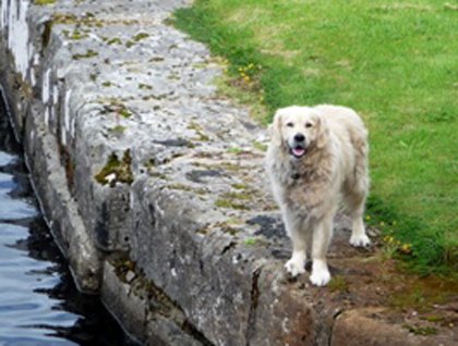 A damp day soon turned dry and later on became glorious sunshine as we set off along the Caledonian Canal. Once we had passed Moy Bridge, the last of the original swing bridges, still operated by hand, Ian Bullock gave a presentation on the wildlife of Scotland. This took us to Gairlochy locks. Still moving up the canal, we locked through these and listened to Konia’s presentation on lighthouses in Scotland, their builders, history, keepers etc. After Laggan locks we had reached the highest point of the canal (106 ft above sea level) – enjoying the Laggan Avenue and Loch Oich over lunch. Just the other side of Loch Oich, past Aberchalder swing bridge, we had an expectant fan of the Lord of the Glens waiting for us. Skipper is a golden retriever that belongs to Mark, a former lockkeeper. Now he spends his days at the café his owner is running, but he still remembers the ship. Sometimes a stray sausage from the galley flies his way... Today he was certainly in luck, not a lot of canal spectators have venison flung at them. And then Skipper watched us sail onward towards Cullochy and Kytra locks, where the walkers, cyclists and kayakers got off. The 2 ½ miles to Fort Augustus seemed to take no time at all – walking, cycling and kayaking in the sunshine. After the ship had travelled through the five locks at Fort Augustus, she tied up at Inveroich pier with magnificent views of Loch Ness.