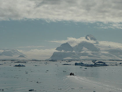 We are so far from the rest of the world that the twinkling of a light-bulb upon the shore startles our senses. Vernadsky Station blinked a hello as we passed in dawn's early light. Above, half a moon glowed in the ever brightening sky. In the distance the Lemaire Channel focused our attention on Mount Français as it was washed with gold, then pink and blue. Slowly the sun worked its way above the peninsular peaks changing the water of the Penola Strait to silver and painting random bergs with gold while leaving others bearing the blue-gray hues of twilight. Penguins ruffled the smooth surface of the sea. Their white skullcaps and bright red beaks could only be interpreted as saying, "We are gentoo."