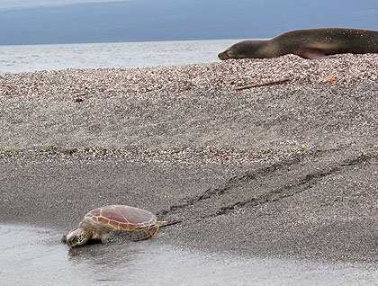 We ended this morning with some great snorkeling. We encountered lots of sea turtles. Some of them were resting at the bottom, others were actively feeding. Some of our guests were followed by a curious cormorant; others got inspected by a sea lion. It was a very fun experience.