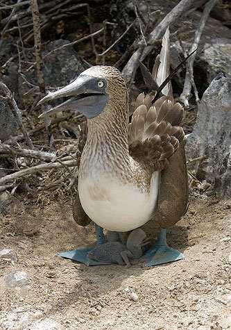 As we walked by the endless boulders of the island, we saw blue footed boobies in their nests with one or two chicks in each nest.