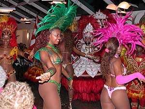 This morning, we entered the spectacular Baía de Guanabara, which holds the port of Rio de Janeiro. The city sits at the foot of an impressive group of stone monoliths, including Sugar Loaf and Corcovado, created by a very resistant granitic gneiss which weathers into and gigantic, smooth-sided, cream-colored peaks which rise behind the high rise buildings of this lively metropolis. We divided into three groups. One visited the Rico de Corcovado and the statue of Christ the Redeemer. A second groupdrove along the coast to a reserve which protects some of the remaining populations of the Golden Lion Tamarind monkeys, endangered throughout their range due to deforestation. The third group toured the city by jeep. In the evening, we were treated to a wonderful churrascaria dinner which followed a demonstration of samba, Rio de Janeiro style. Although it was Halloween, the dancers were not dressed for that occasion (although it is difficult to imagine that the citizens of Rio would miss any excuse to dress in elaborate costumes). These dancers don these costumes through out the year to perform the samba, the national dance of Brazil. As the evening progressed, most of the guests from the National Geographic Endeavour joined the dancers in an energetic display of flesh and aerobic talent. We returned to the ship sated but energized, ready for a bit of sleep before beginning one of the several outings scheduled for the morning.
