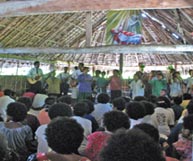 Afternoon. Our first PNG island expedition stop! The Budi Budi Islands! Finally! So many of us were eager to visit these extremely remote islands having heard about the Kula Trade and as well as the reputation for remarkable wood carvings. Upon landing on Bodaluna Island we all were carried to the church by the sweet, melodic voices of men and women singing earnestly accompanied by a couple guitarists. The men and women attendees separately sand-seated. The thatch was thick and long and wide and ever so high! Noticing lashing was not employed, we learned that the structure had been built hurriedly following the church’s total destruction in last year’s cyclone.