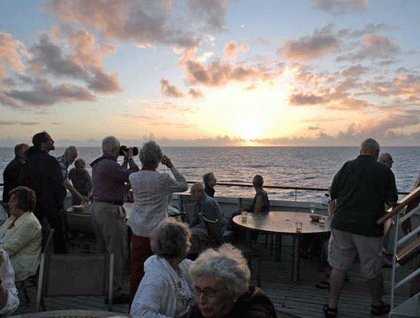 About 1600 we crossed the Tropic of Capricorn, the southern boundary of the tropics. We will be in the tropics now until the end of this voyage. To celebrate this milestone, we had a cocktail party on deck and everyone turned out to enjoy the warm breezes and fine companionship. We watched as the sun set through the light clouds on the horizon, hoping for a green flash. We were not disappointed, for we were rewarded with a very bright flash of green which tuned even the most skeptical among us into converts. It was pretty hard to miss.