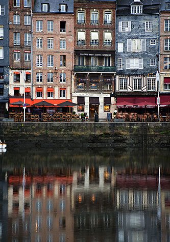 Honfleur was a favorite of French painters of the 19th century. Courbet and the leading Impressionist Monet – whose teacher and early Impressionist Eugene Boudin was born here – often painted here and the village became so famous that it developed its own style, referred to as “Ecole de Honfleur.” Although this area of Normandy was shattered during WWII, Honfleur was not bombed and hence its architecture is largely intact. The most picturesque houses surround the Vieux Bassin (the old docks) which are located in the center of the old town. The houses are chiefly from the 16th and the 17th centuries and are so tottering that they look as if they are about to tumble over.