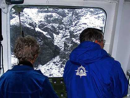 Cold wind and snow kept most people inside and the Bridge proved to give the best vantage (see image, top L). The mountainsides in this fjord are very steep and seem to rise straight up out of the sea, but we were still amazed to find the water in front of the glacier was more than 700 feet deep!