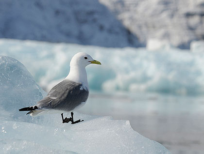 After breakfast we set out in Zodiac and kayaks in the most perfect of conditions. Icebergs of all shapes and shades of blue surroundeded us. Kittiwakes rode upon their crests. An unusual white, black guillemot was discovered, its partial albinism in stark contrast to its naturally colored black and white cousins.