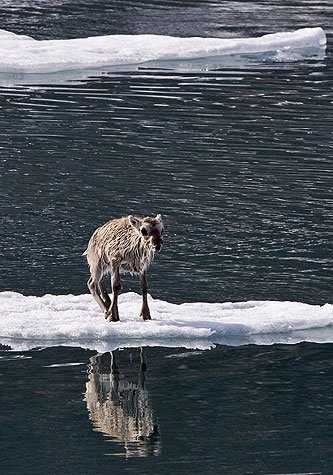 Afternoon light found us pushing through ice floes on our way to inspect the Monaco Glacier. A call came from the bridge of a sighting of a small four-legged animal on one of the floes close to the glacier itself. Upon closer inspection we were all surprised and amazed to find out that the small animal was a young caribou, evidently far from the herd, its mother, and LAND! The calf swam from floe to floe, looking and listening for its kind.