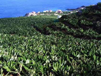We are spending all our time here in the western Canaries, which are noted for having better climate, more dependable rainfall, and richer soils than the eastern islands. The mineral-rich volcanic soil is ideal for both temperate and tropical agriculture, so the early Portuguese settlers were quick to introduce sugar cane in the early 1500s. This “white gold” proved to be a great success and lead to many years of huge profits. By the end of the 16th century, wine grapes had been introduced, and Canarian wines also were very successful. By the end of the 17th century, the Canary Islands had become an important trading center with ties to many European countries as well as the Americas. Today, however, the most important agricultural product, indeed the most important economic entity of the island, is the banana. Much of the landscape is composed of terraces to accommodate the valuable banana plantations (left photo).