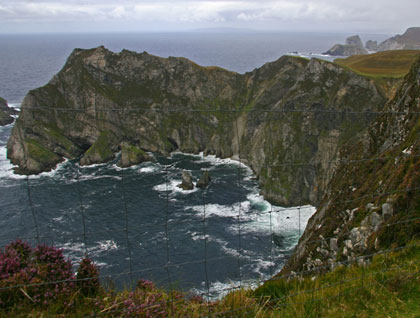 The quiet, green valley has quaint homes, quiet streams, endless stone walls and grazing sheep. We walked up a steep hill to a Napoleonic-era tower, then to a meek fence near the sea cliff edge. The vista was stunning: sheer cliffs topped by pink heather, waves pounding rocks far below, and sea stacks just off rocky points. The sky was dark, dramatic and cloudy, and while rain pelted the surrounding area, we were spared a soaking.