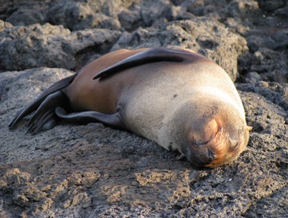 After our aquatic activities we went around Champion Islet looking for the elusive Floreana mockingbird, and some of the sea birds that are found in large numbers around these waters. We encountered blue-footed boobies, Nazca boobies, brown pelicans, Galápagos shearwaters, storm petrels, and tropic birds; sea lions followed us during this Zodiac ride.