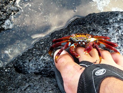 In the afternoon during the walk on Fernandina Island, we felt like travelling back in time; Fernandina is a very pristine place and it is the youngest of all the islands in the archipelago, and that is why you see new basaltic lava flows all over the place. We also called it “lizard city” for the amount of marine iguanas sun bathing. There were also Sally Lightfoot crabs along the jagged shore lines, and I even had a close encounter with one of them when it climbed my foot and gave me a “free pedicure” (to tell you the truth, I enjoyed it a lot!)