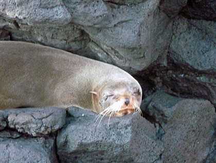 As soon as we started our walk we found a lava lizard trying to eat a scorpion that was not giving up easily. Along the trail we saw a few Galápagos mockingbirds, a Galápagos hawk, Marine iguanas, and the Galápagos fur seals that were comfortably sleeping in the grottos.