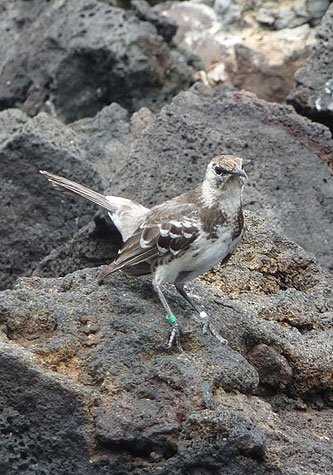 While we enjoyed eggs benedict and fresh fruit (or cereal and many other breakfast options) the Captain repositioned the ship to Champion Islet on the east cost of Floreana. We headed out in our fleet of floating black limos (the Zodiacs) with a Naturalist in each and found several of the elusive Floreana mockingbirds and many red-billed tropic birds. Most of the tropic birds were spotted via their tail feathers which poked from the nest holes they were using, but one dramatically flew over and another landed outside his hole and sat, in all his sleek, and splendid, silky white with a fire-engine red bill glory – right on the black lava rocks for our delight and the benefit of our cameras.