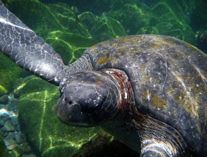 Back on National Geographic Islander, twenty of us wiggled into our wet suits and grabbed our blue bags of snorkel gear. We slipped into the calm water in a protected bay and had an absolutely marvelous hour swim with penguins, cormorants, sea lions and 82 sea turtles! The bay was literally dotted with bobbing turtles; they were floating, swimming, sleeping on the sandy bottom and grazing on algae off the rocks. In turn, fish were feeding on the algae on their shells. It was magical to swim, un-noticed among them. When they surfaced for air we had to avoid them bumping into us! I counted the turtles and noted their sex and size (adult or juvenile) and this data will be handed over to the Charles Darwin Research Station.