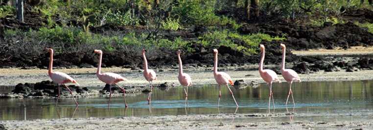 During the night the National Geographic Polaris was repositioned to the northern part of Santa Cruz Island. We were anchored in Conway Bay, a beautiful and calm location that has an impressive volcanic setting, Cerro Dragon or Dragon Hill. We hiked through the arid vegetation zone of this remote area in the search of the “dragons of the Galápagos” – the Galápagos land iguanas. Very close to the disembarkation point there is a paradisiacal little lagoon. This lagoon is literally located in the middle of nowhere. Today we were extremely lucky to observe a flock of Greater flamingoes that were proudly walking at a close range from their observers. The flamingoes’ coloration was astounding and contrasted in a great way with the surroundings. The whole scene was as close to a painting as you can imagine.