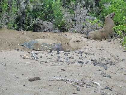 Two hours by boat from the port town is a bay called Post Office Bay. A few minutes before we disembarked at the beach we saw a lot of sand coming out from the bushes, but we did not know what it was because a sea lion was walking by at the same time. We got closer and a great surprise appeared; it was a marine turtle just finishing its nest and covering it with sand – in day time!