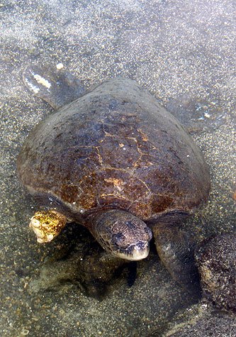 One tidepool held a female marine turtle that has been seen in the area for the last month or so. With one front flipper missing, we’ve been watching as the healing process advances. Small fish and shrimp have been cleaning the wound, and it now looks quite a bit better. Life goes on no matter what.
