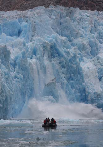South Sawyer Glacier is a part of the Stikine Ice field (1 of 3 ice fields in Southeast, Alaska) and is roughly 25 miles long, reaching the Canadian border about 12 miles from its face. Getting closer to the glacier the before breakfast bow crowd saw impressive calving from afar. Fingers crossed we boarded trusty Zodiacs and inched our way though ice after breakfast exploring the denizen of harbor seals in the echo of occasional icefall. The other worldly scene of a tidewater glacier is humbling for we are reminded through the power of “white thunder” that we are but a small mark on the bigger map of the universe. It wasn’t long before the face of South Sawyer became unglued, unleashing towers and faces of white and blue ice along its ¾ mile long face. Between the glacial hue of blue, the sound of calving ice, and the waves caused by birth of brash, growler, bergy bit and iceberg our experience in Tracy Arm will long be one we remember.