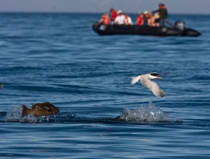 Late in the afternoon, we investigate the tiny bird sanctuary of Isla Rasa by Zodiac. The island is a success story for the eradication of rats that once decimated the resident bird populations. Isla Rasa is the nesting spot for 95% of the world’s Elegant Terns and Heermann’s Gulls. The birds have recently arrived and if the noise level is any indicator, the mating process is in full swing. The activity seems to pick up as the sun sets with the silhouette of flapping wings filling the horizon. The shades of orange in the sky make the water seem extra blue on this magical Baja California evening.