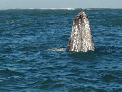 We went whale watching on Zodiacs this morning. We saw California gray whales swimming around in the bay called Boca de Soledad at the north end of Magdalena Bay. There were whales spouting, diving, and spy hopping. Several of us saw a mother/calf pair too. We were close enough to see the barnacles and the double blowholes on the whales. We followed one adult for over thirty minutes as she swam in the bay.