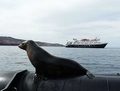 After our ship dropped the anchor we set up the platform for snorkeling and played amongst the most acrobatic of all the pinnipeds, the sea lions. Los Islotes is known world-wide for the “tameness” of these animals. The light was bright and the ocean very calm, so visibility into the water allowed spectacular views of the sea lions playing and wandering around us. Other sea creatures were seen as well, like sea urchins, schools of different fish species, crabs, sea stars, and so on. Above the surface of the water, while doing Zodiac boat cruises, our teams found, either flying and gliding, or just perched on the steep cliffs, dozens of blue-footed boobies, brown boobies, brown pelicans, yellow-footed gulls and others. The scenery was very enjoyable, especially for the dramatic aspect of the rock structures, of volcanic origin, that were carved after thousands of years of weathering and erosion. While on these thoughts, unexpectedly a young sea lion jumped up over one of the Zodiac boats, and posed for us!