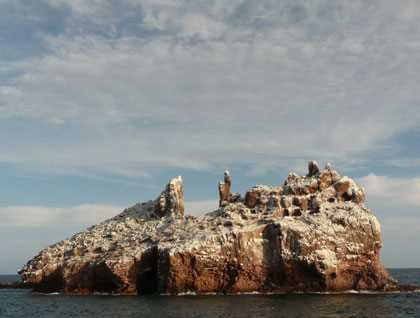 Dozens of bottlenose dolphins dashed toward the bow jostling with each other for the prime spot on the pressure wave. A smattering of sea lions joined the frenzied dash but lacking the cetacean’s skills, hesitated and simply porpoised through our wake. The blow of a whale was camouflaged by waves surging upon the shore and its flighty behavior confused us all until the islets loomed large and so did the gray-blue back of the largest animal of all. Blue whales were now old hat and we paid it little heed for an invitation echoed from the base of the cliffs. “Come and play,” they seemed to say. And so we did. Some slipped into the water to be shamed by the agility of these frisky pinnipeds. Others, armed with cameras, cruised around the rocks followed by frisky young sea lion flocks. Above brown boobies croaked and male blue-footed boobies whistled their courtship call while they displayed their cerulean feet.