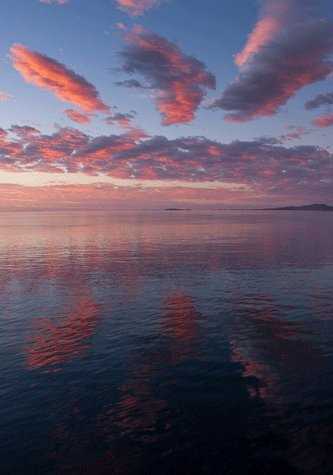 It was an awe-inspiring sunrise along the eastern side of Isla Angel de la Guarda. The sky was gorgeous with slender fingers of clouds in the east, lit up with scarlet edges. To the west were mountainous layers of geologic formations in stunning shades and tones with fiery clouds above. The light was dramatic, as the mountains lit up in the sun with stormy dark clouds behind.