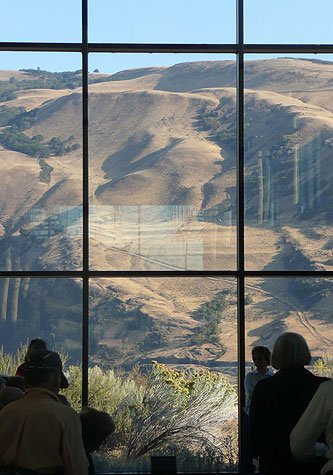 What a fantastic day from sunrise to well after sunset. Shortly after breakfast we headed off to the Columbia River Gorge Discovery Center. Onlookers took pleasure along the way with the hazy view of Mt. Hood off to the left; its pointed peak lets us distinguish it from the rounded top of Mt. Adams off to our right.