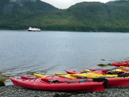 The guests of the National Geographic Sea Lion stirred this morning to find themselves at a very peaceful anchorage in Cross Sound. Looking across the water to Shaw Island, one could see the colorful kayaks awaiting the embarkation for their circumnavigation of the island. We paddled away from shore along with the outgoing tide, battled our way through the Bull Kelp forest and out into the open water. As our watercrafts glided smoothly across the water, we were able to tune in to the sounds around us: the high-pitched cry of the bald eagles, the short exhalation of the harbor seals coming up to look at us and the occasional humpback whale spout off in the distance. There were a number of juvenile bald eagles perched in the trees and some of them flew by overhead as we passed. As we rounded the island, we got a closer look at a group of seals hanging out in a mass of kelp, maybe trying to catch the occasional ray of sunshine breaking through the clouds.