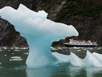We dropped Zodiacs to get a closer view. And as we neared the Sawyer Glacier, we realized that the icebergs we had been enjoying were mere whelps compared to the monsters before us. These icebergs had recently broken from the depths of the glacier, and so were unbroken by crevasses. Some seemed newly made, fresh as a song, and were the most profound shade of sapphire blue. Others seemed ancient, broken and corroded, as if the bleached landscape of some distant and chilly planet. The glacier tumbled from the mountains, its fractured surface a chaotic staircase. The face of Sawyer Glacier stands one hundred and fifty feet above the sea, and only the calving of bergs, so large that they seemed to fall in slow motion, gave us an idea of the scale of the scene surrounding us.