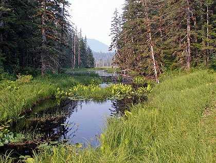 Bog, muskeg, peatland; about fifteen percent of the Tongass National Forest is covered by soggy sphagnum mosses surrounding small ponds that reflect the lichen coated and stunted trees of this special habitat. Cool wet summers and areas of poor drainage promote the formation of muskeg, and the buildup of partially decomposed plant materials creates a rather acidic condition inhospitable to the usual forest plants. This allows different species of trees and unusual miniature plants a place to succeed.