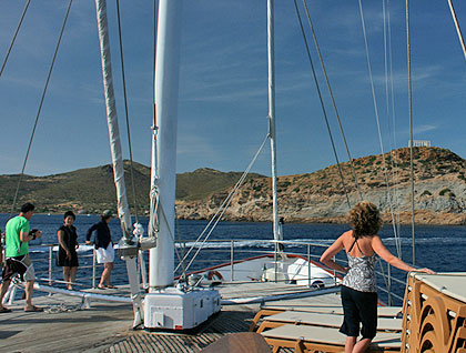 We arrived at Mykonos on schedule for our excursion to this internationally renowned resort only to find that strong breezes and swells had caused a congestion of monster cruise ships waiting for docking berths. We were forced to wait our turn as conditions worsened. After one try to dock failed, there followed a long wait for a second opportunity to arise. None did, and our captain finally decided that we would not be able to make our shore excursion, so we headed away towards our evening’s anchorage in Naoussa Bay, Paros. Our disappointment about missing Mykonos was softened by an impromptu Greek lesson by our two wonderful, resourceful Greek guides, Stella Galani and Ellie Haralambous.