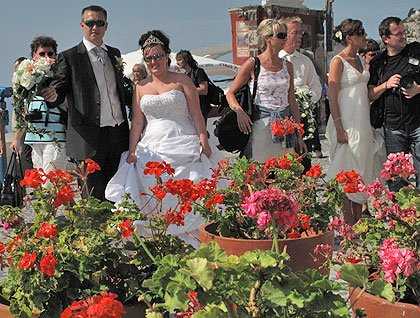 Later in the afternoon, while exploring the town of Thira, we found more newlyweds striding through the streets in sunglasses and gowns, continuing to take advantage of the stunning backdrop of ocean and islands for their wedding portraiture.