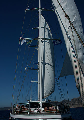 Mid-afternoon, as the breeze freshened, we cast lines and set sail to the southwest. We had a perfect angle on the wind, so we were able to hoist the sails and turn off the engines for several hours.