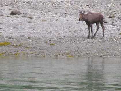 Pulling into Tidal Inlet, we found a moose. Though abundant in Glacier Bay, moose are shy and very difficult to spot. Glacier Bay has been an excellent habitat for moose since the 1800’s, but they found the place only recently: the first moose was seen in Glacier Bay in 1967. This moose stuck to the shoreline even when we approached, and with ears generally hard aft, he seemed rather ambivalent about his situation. And no wonder, we saw him favoring a hind leg, the result of a recent injury. His slightly damp look and a radio report of wolves sighted that morning on the opposite shore suggested a story: perhaps the moose had stumbled in wild flight from the wolves and had saved itself only by a chilly swim.