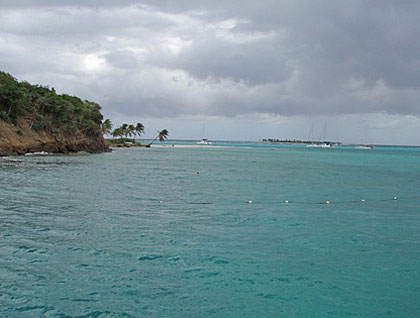The afternoon's activities gave us an opportunity to interact with the marine environment in more ways than one. There was optional snorkeling from a catamaran and swimming from a secluded beach, both activities affected by torrential rain from passing squalls. In the water was the best place to be, with good swimming and snorkeling, including sightings of green turtles. For those who remained above water, a liberal supply of distilled sunshine in the form of rum punch more than made up for deficiencies in the weather.