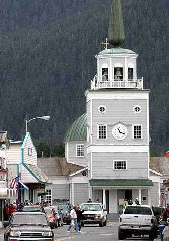 Several guests opted to visit the nearby Sheldon Jackson Museum. This octagonal building – built to suggest a Northwest Coast Indian community house – was constructed in 1890 under the supervision of Dr. Jackson. Sheldon Jackson was a Presbyterian minister and former General Agent of Education for Alaska who first introduced reindeer to Alaska as a source of food and clothing for Eskimo (Inuit) people. Many guests then walked or rode to downtown Sitka, stopping along the way to visit one of only four Alaska buildings hand-hewn by Russian and Finnish artisans in 1842. Originally built as a bishop’s residence and center of Orthodox ecclesiastical authority in Alaska, it is today owned and managed by the U.S. National Park Service. The last significant stop on the guest tour was St. Michael’s Russian Orthodox Cathedral, the central architectural feature and symbol of downtown Sitka.
