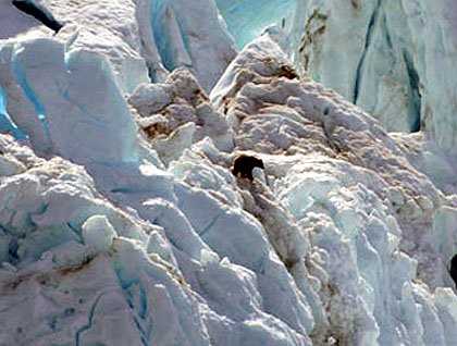 As we headed down the bay, we wondered, would the bear survive? No way to tell. But it is easy to project our own feelings and capabilities onto him. Though the bear seemed to lie down in perplexed despair, like as not he was merely cooling down on a “hot” sunny day. Bears are marvelously sure-footed and agile, and a half-mile clamber through seracs and crevasses would be nothing like the challenge we might face in a similar situation.