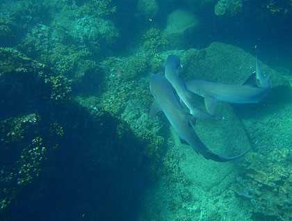 Flitting among these corals were thousands of colorful reef fish, such as Panamic sergeant major, scissor tail chronis, bicolor parrot fish, guineafowl puffers fish, and Moorish idols. The great highlight of our day, however, was snorkeling amongst those most perfectly adapted predators of the sea: the sharks.