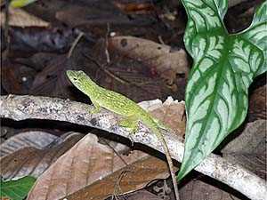 Bright sun to deep shade provided a luxury of lizards, bats, and birds, plus rain frogs in the fallen leaves. The green tree anole (Norops biporcatus) shown here can be distinguished from almost all other anoles in Central America by its large size (about one foot total length) and its bright green color. When frightened, this lizard can change from bright green to dark brown and back in seconds. A solitary species, the green tree anole often basks in diffuse sunlight on branches or vertically on tree trunks with its head up. It feeds mostly on insects and spiders, but will also eat smaller lizards.